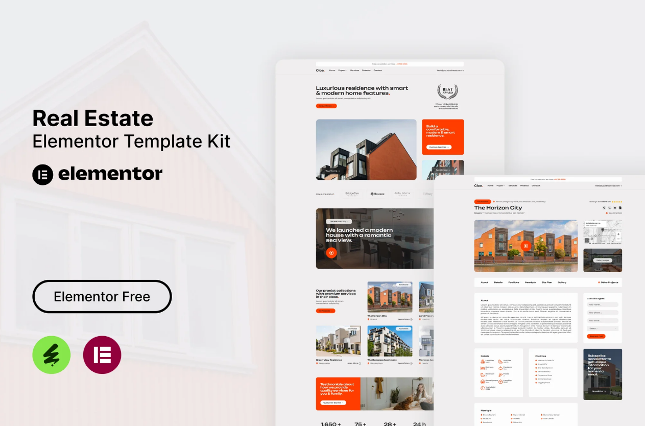 Cloe – Real Estate Elementor Template Kit. This template kit is a fully responsive, clean and customizable. This template is suitable for use in businesses, such as: Real Estate Agent, Property Agent, Property Developer, Architect Consultant, House Agent and others.