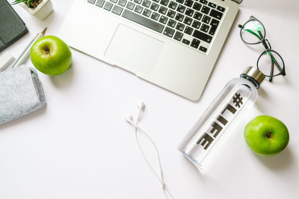 Creative Office table for healthy person with laptop, pencils, water, apple, glasses on white background. Top view, flat lay, space for text